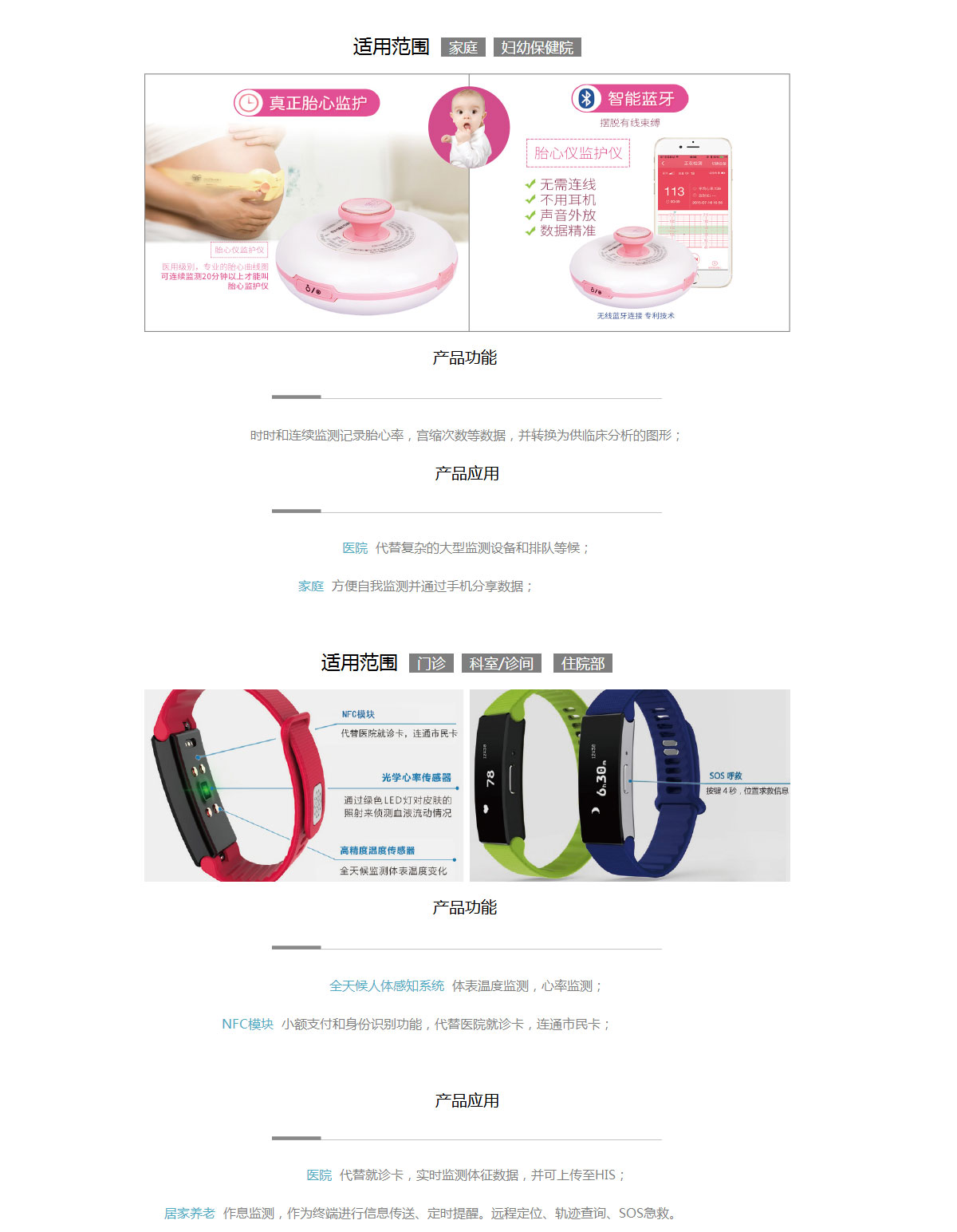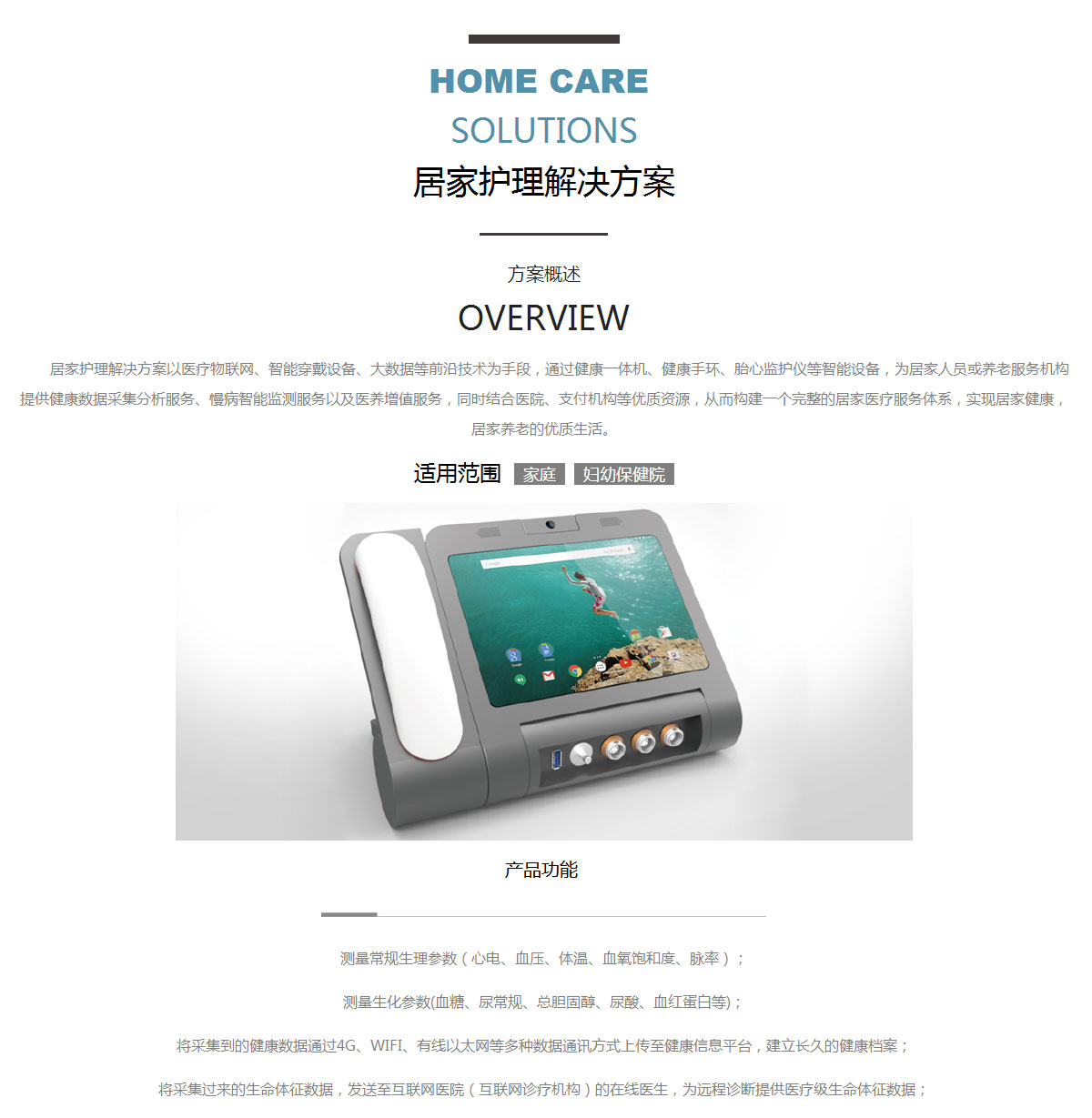 居家護(hù)理解決方案以醫(yī)療物聯(lián)網(wǎng)、智能穿戴設(shè)備、大數(shù)據(jù)等前沿技術(shù)為手段,通過健康一體機(jī)、健康手環(huán)、 胎心監(jiān)護(hù)儀等智能設(shè)備,為居家人員或養(yǎng)老服務(wù)機(jī)構(gòu)提供健康數(shù)據(jù)采集分析服務(wù)、慢病智能監(jiān)測服務(wù)以及 醫(yī)養(yǎng)增值服務(wù),同時(shí)結(jié)合醫(yī)院、支付機(jī)構(gòu)等優(yōu)質(zhì)資源,從而構(gòu)建一個(gè)完整的居家醫(yī)療 服務(wù)體系,實(shí)現(xiàn)居家健康,居家養(yǎng)老的優(yōu)質(zhì)生活