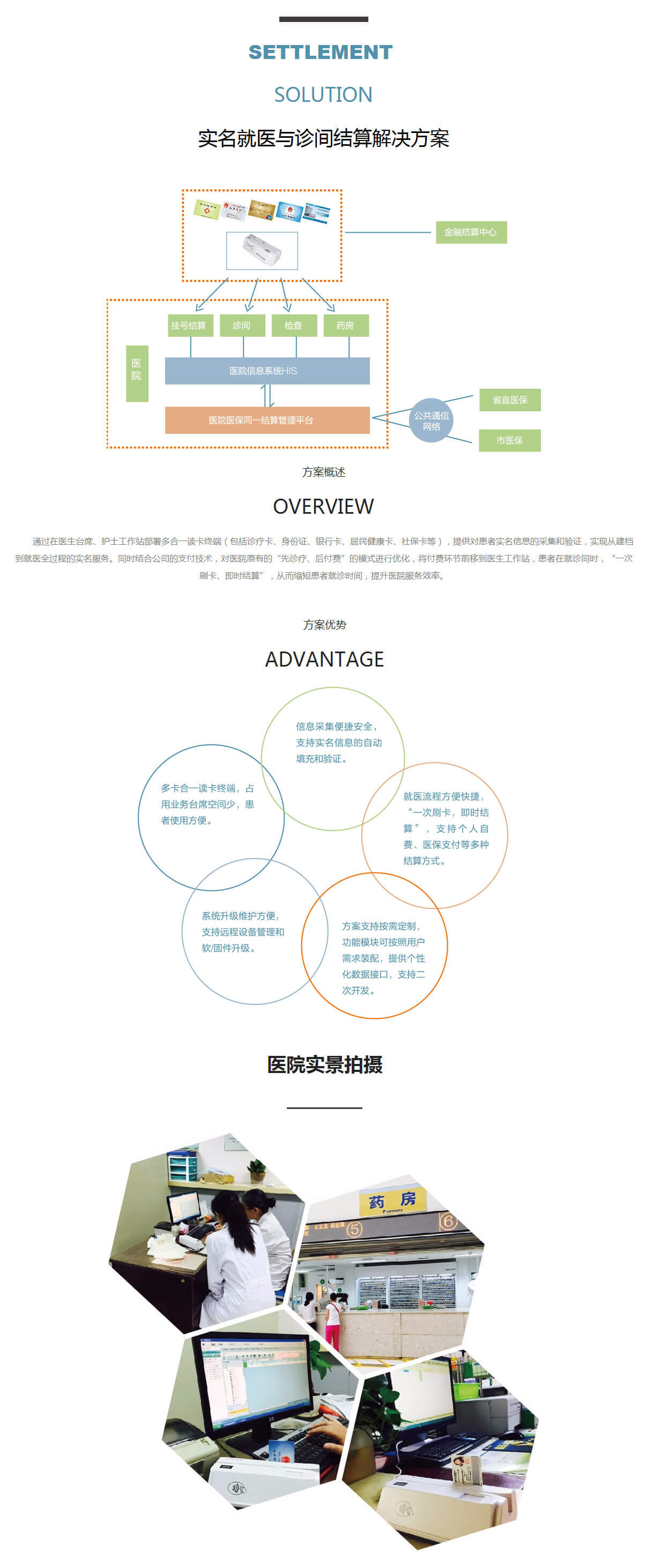 通過(guò)在醫(yī)生臺(tái)席、護(hù)士工作站部署多合一讀卡終端(包括診療卡、身份證、銀行卡、居民健康卡、社??ǖ龋?,提供對(duì)患者實(shí)名信息的采集和驗(yàn)證,實(shí)現(xiàn)從建檔到就醫(yī)全過(guò)程的實(shí)名服務(wù)。同時(shí)結(jié)合公司的支付技術(shù),對(duì)醫(yī)院原有的“先診療、后付費(fèi)”的模式進(jìn)行優(yōu)化,將付費(fèi)環(huán)節(jié)前移到醫(yī)生工作站,患者在就診同時(shí),“一次刷卡、即時(shí)結(jié)算”,從而縮短患者就診時(shí)間,提升醫(yī)院服務(wù)效率。